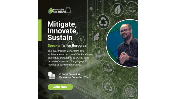 Join us on December 17th from 10:00-11:00 am EST where SustainableArchitectures.org will host Wilco Burggraaf who will be presenting: Mitigate, Innovate, Sustain